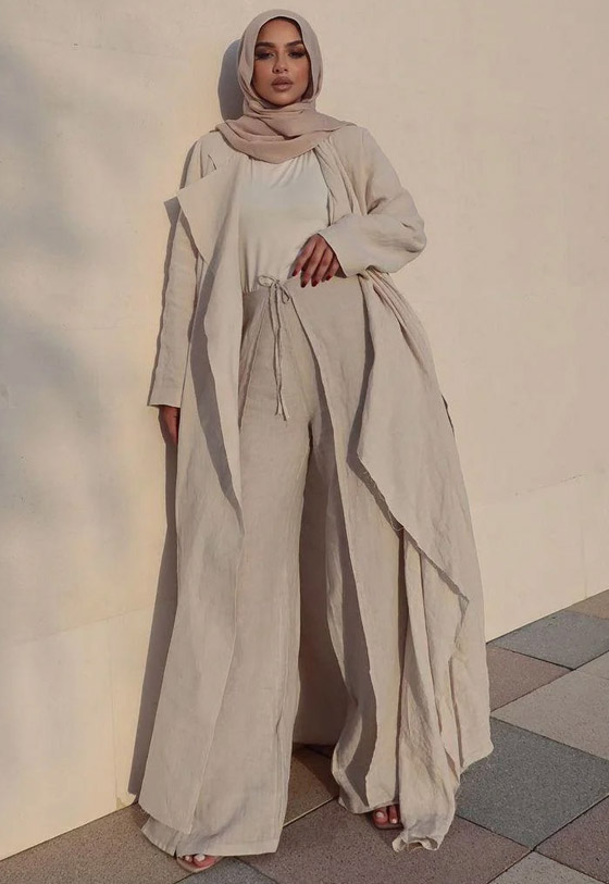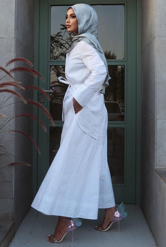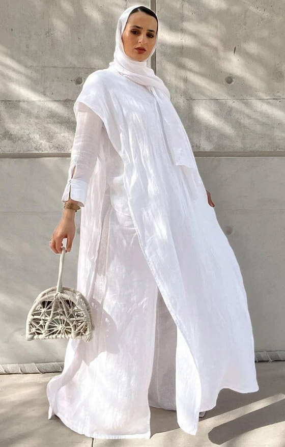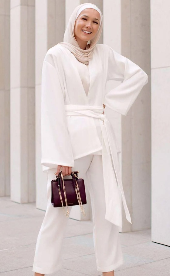 يضفي اللون الأبيض لمسة ملائكية تعشقها الكثيرات وقد برزت موضة اعتماده في كامل الطلة من خلال الأطقم الواسعة التي تألقت بها الفاشينيستا المحجبات، نسقي التوب الطويل الأشبه بالقفطان مع بنطال أبيض من نفس اللون مع طرحة بيضاء وصندال أبيض وأحملي حقيبة السلة الرائجة. نسقي الكيمونو الأبيض القصير مع بنطال أبيض بقصة مستقيمة واعتمري طرحة باللون الأبيض الكريمي وانتعلي صندال بكعب عالي من نفس لونها وتممي اللوك بحقيبة كتف صغيرة باللون البرغندي.
