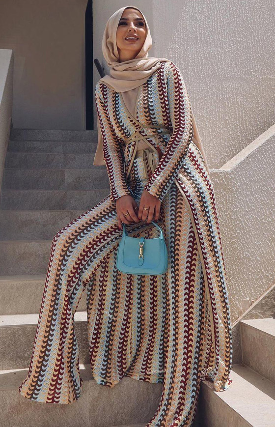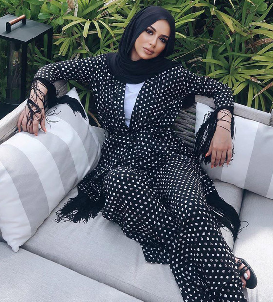 بجانب الأطقم السادة أحببنا الأطقم المزينه بالطبعات خاصة تلك التي ظهرت مؤثرة الموضة المحجبة سهى، على غرار الفاشينيستا سهى نسقي الطقم المطبع بشكل عامودي مع توب وطرحة وصندال باللون النيود على أن تكون الحقيبة بلون موجود في طبعة الطقم. نسقي الطقم الأسود المنقط بالأبيض والمزدان بالأهداب السوداء حول الحواف مع توب أبيض وطرحة سوداء على طريقة مؤثرة الموضة سهى وتممي أناقتك بصندال أسود.