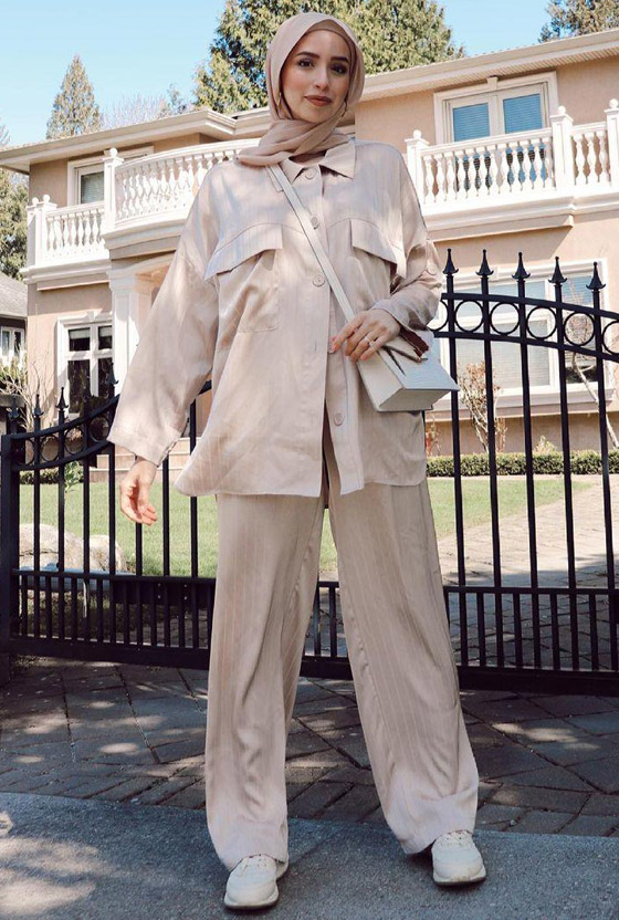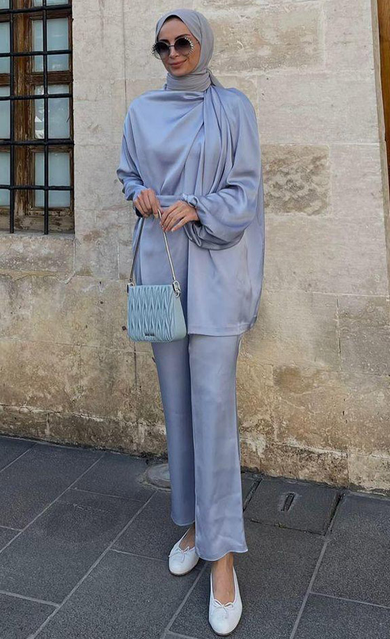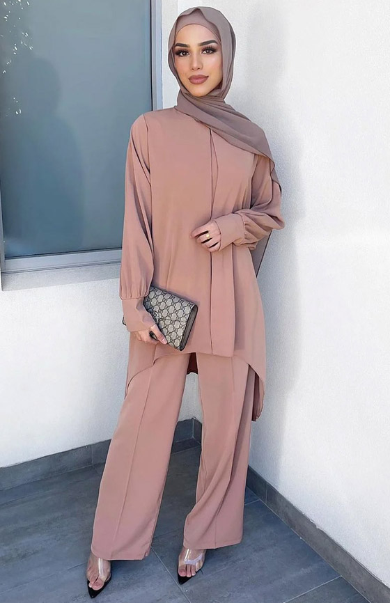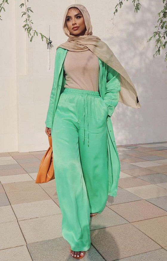 سيطرت موضة الأطقم السادة المرتكزه على ألوان الطبيعة الترابية على إختيارات الفاشينيستا المحجبات، في المساء نسقي الطقم الحرير بلون الكاكاو مع صندال شفاف وطرحة بلون الطقم ولكن بدرجة أغمق وحقيبة كلاتش مطبعة.
