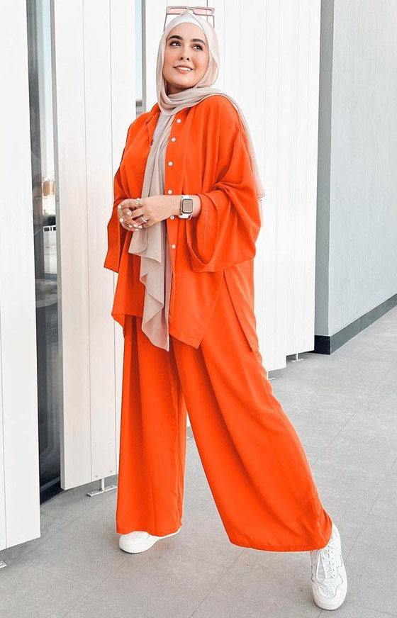 هيمنت صيحة الألوان الزاهية والجريئة على أزياء صيف 2022 وقدمت بها أطقم كاملة، نسقي الطقم البرتقالي المؤلف من قميص طويل وبنطال واسع الأرجل مع توب أبيض وسنيكرز بيضاء وزيني رأسك بطرحة بيج. نسقي الطقم الأخضر التفاح المؤلف من تونيك طويل وبنطال واسع عالي الخصر مع توب وطرحة بيضاء على أن تكون الحقيبة والصندال باللون البرتقالي الدارج.