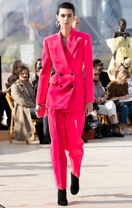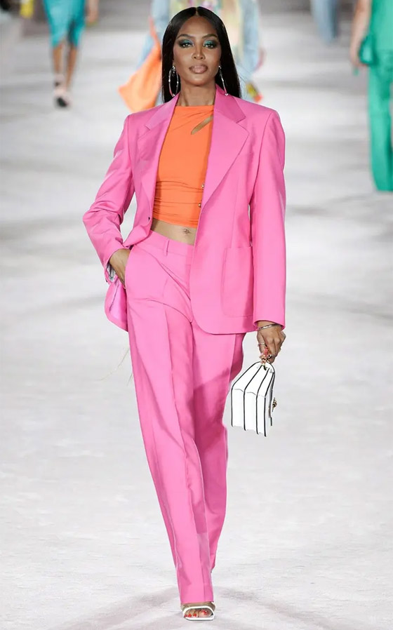 لإطلالة لافتة يمكن اختيار قطعة لافتة باللون الوردي قد تكون سترة "بلايزر" أو سروال واسع أو تنورة أو حتى قميص، كما يمكن تنسيقه على الشكل التالي: