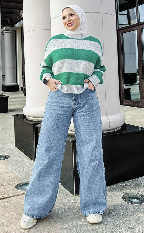 1. الكنزة المخططة من جهاد البنا: الكنزة المخططة قطعة قادرة على البقاء في خزانة الملابس لسنوات دون أن تنتهي موضتها أبداً، مما يسمح بالتجديد من خلال مجموعات مبتكرة موسماً بعد موسم، واعتمدتها مدونة الموضة المحجبة جهاد البنا بتصميم اللون الأخضر والرمادي المخطط عرضياً مع بنطلون الجينز الواسع، وأكملت تفاصيل إطلالتها باللون الأبيض.