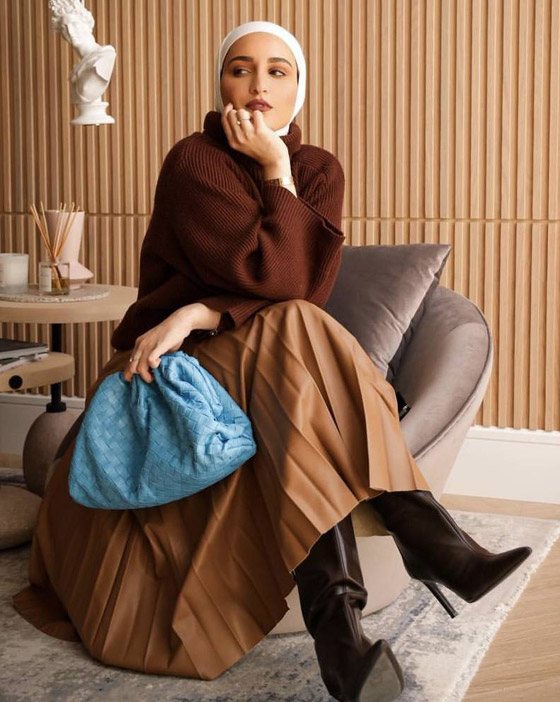 2. دلال الدوب بإطلالة خريفية: الكنزات الخفيفة من أهم قطع الملابس التي يجب توافرها في خزانتكِ؛ حيث تناسب جميع الأحجام وأشكال الجسم المختلفة، كما أنها اختيار جيد للمحجبات اللاتي لا يرغبن في ارتداء أكثر من قطعة لتغطية الذراعين، وأطلت مدونة الموضة واليوتيوبر الكويتية دلال الدوب بكنزة باللون الأحمر الداكن مصممة بأكمام واسعة ورقبة مرتفعة، مع تنورة بليسيه من الجلد البني، وأكملت أناقتها بحقيبة زرقاء وبوت أسود طويل.