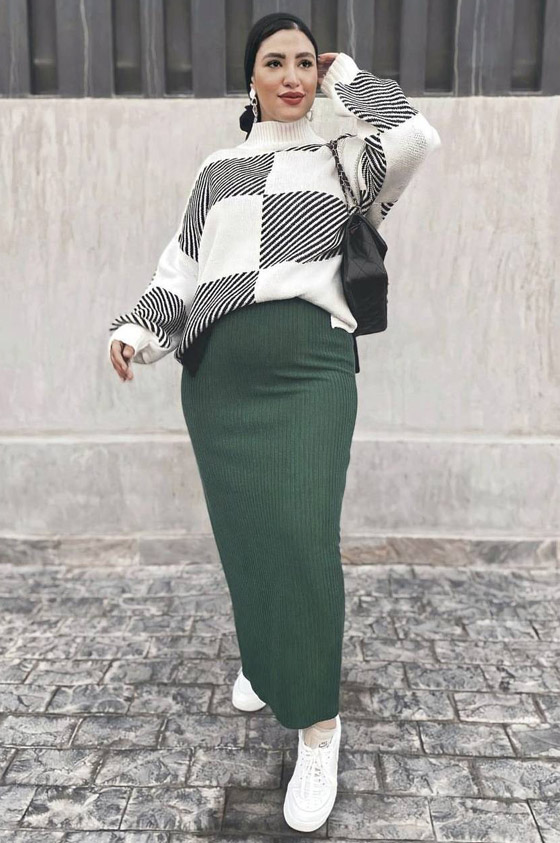 3. دينا رزق بإطلالة عصرية: قدّمت دور الأزياء موديلات وتصاميم تناسبك كل امرأة وتحاكي ذوقها في المناسبات والمشاوير المختلفة، ولمنحكِ إطلالة رائعة ومميّزة بشكل غير تقليدي، اخترنا لك كنزة بيضاء برقبة مرتفعة مزينة بمربعات ذات خطوط سوداء عصرية من مدونة الموضة المصرية دينا رزق، التي نسقتها مع تنورة خضراء طويلة بقصة مستقيمة، وأكملت أناقتها باكسسوارات حيادية الألوان.