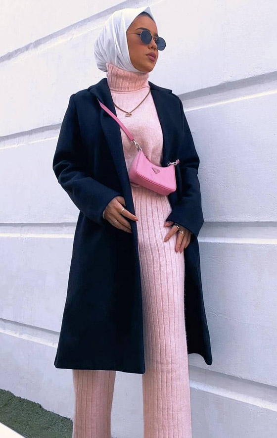 4. سارة الدهيم بإطلالة كاجوال: لأناقة بسيطة وعصرية، اخترنا لك من مدونة الموضة الكويتية سارة الدهيم إطلالتها بكنزة وبنطلون واسع باللون الزهري مصنوعين من الصوف، مع معطف أسود طويل، وأكملت اللوك بحجاب أبيض وحقيبة فوشيا.