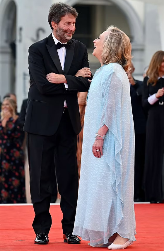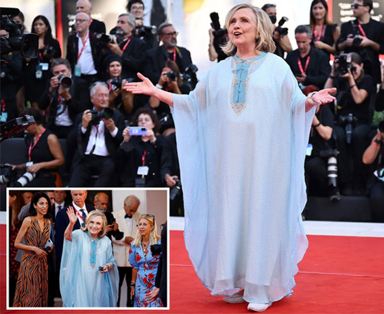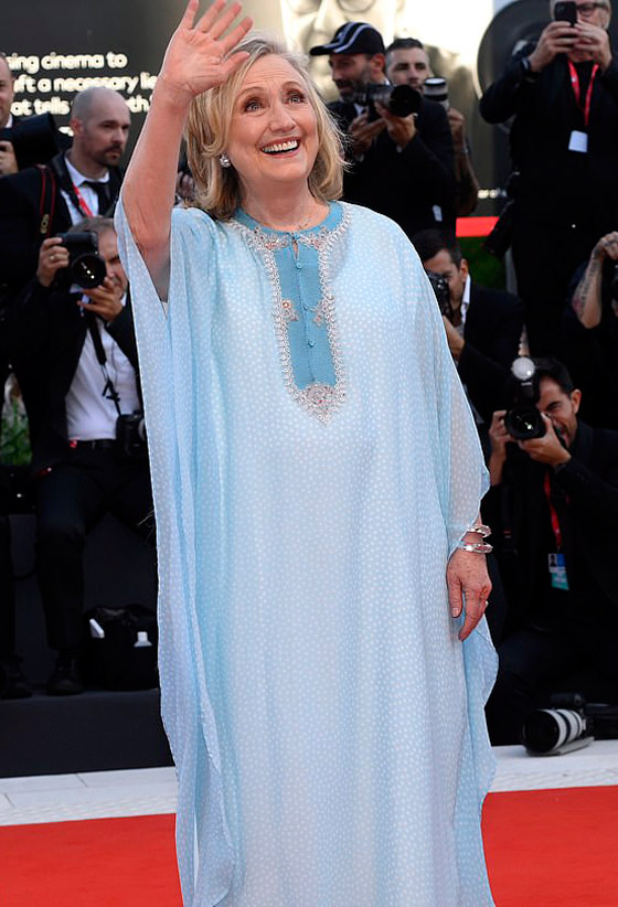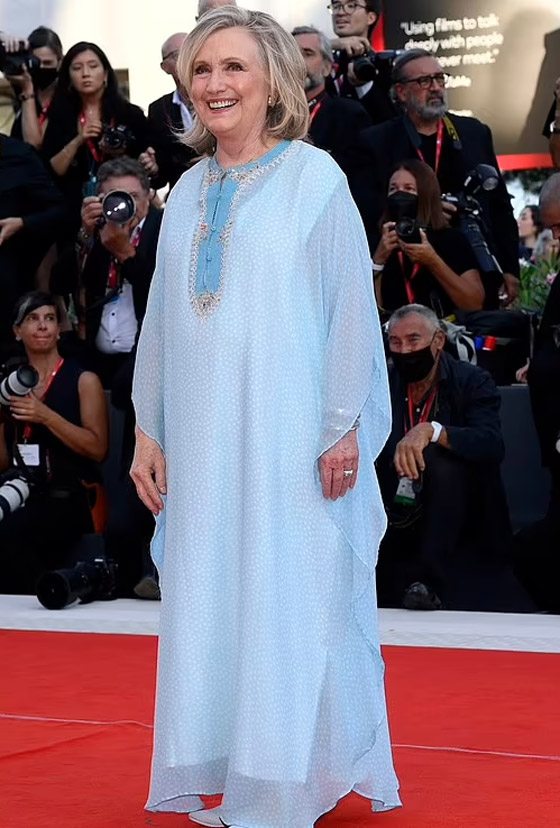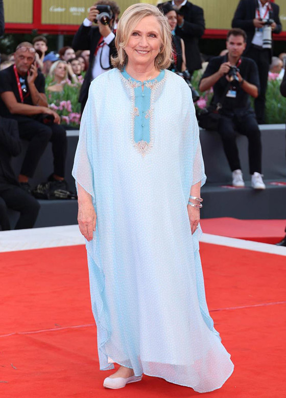 قفطان أزرق واسع، مزيّن بالخرز من ناحية العنق، وبعض الأساور الفضية، وحذاء أبيض مُدبب ذو كعب قصير، بهذا المظهر البسيط، ظهرت وزيرة الخارجية الأمريكية السابقة، هيلاري كلينتون، التي تبلغ 74 عامًا، على السجادة الحمراء بمهرجان فينسيا السينمائي الدولي رقم 79.