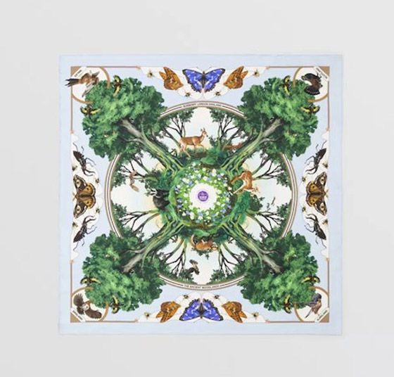 تعد علامة "Burberry" من أرقى العلامات التجارية التي تصنع الأوشحة النسائية، وهذا الوشاح المُذهل من مجموعة النسخة المحدودة للاحتفال باليوبيل البلاتيني للملكة الراحلة إليزابيث الثانية، والمصنوع من التويل الحريري مثالي، فهو مميز باللون الأخضر، ويضم مجموعة من الرسومات الطبيعية، حيث جاء منقوشاً بالأشجار والفراشات والطيور المرسومة باليد.