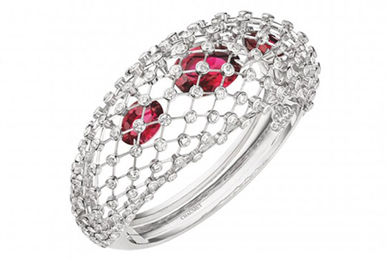 من مجموعة Perspectives de Chaumet من شوميه، تألقي بأجمل سوار مثالي لليلة رأس السنة،. حيث يتميز بتصميم أنيق وراق، من الذهب الأبيض ومرصع بثلاثة أحجار روبيليت قطع بيضاوي ومجموعة من أحجار الماس قطع براق.
