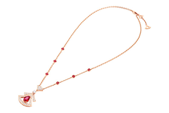 يتميز عقد ديفاز دريم من Bvlgari أنه مصنوع من الذهب الوردي ومرصع بحجر ياقوت أحمر إجاصي الشكل، وأحجار ياقوت وألماس بريلينت مستديرة، ليزيد من أنوثة وأناقة إطلالتكِ.