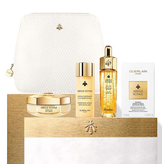 تضم مجموعة Guerlain المخصصة كهدية لنهاية العام، أفضل المنتجات المقاومة للتجاعيد من العلامة الفاخرة، حيث يحتوي الصندوق على كريم النهار، ولوشن غذاء ملكات النحل، وزيت مائي لبشرة شبابية، ومصل مزدوج لتجديد وإصلاح البشرة، وأخيراً حقيبة أنيقة باللون الأبيض تضم المنتجات. إنها هدية مناسبة لمحبات الاهتمام ببشرتهن على الدوام.