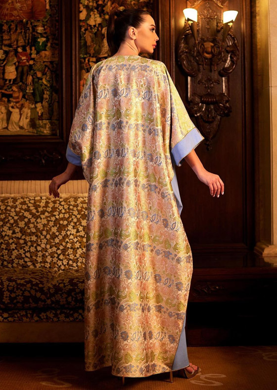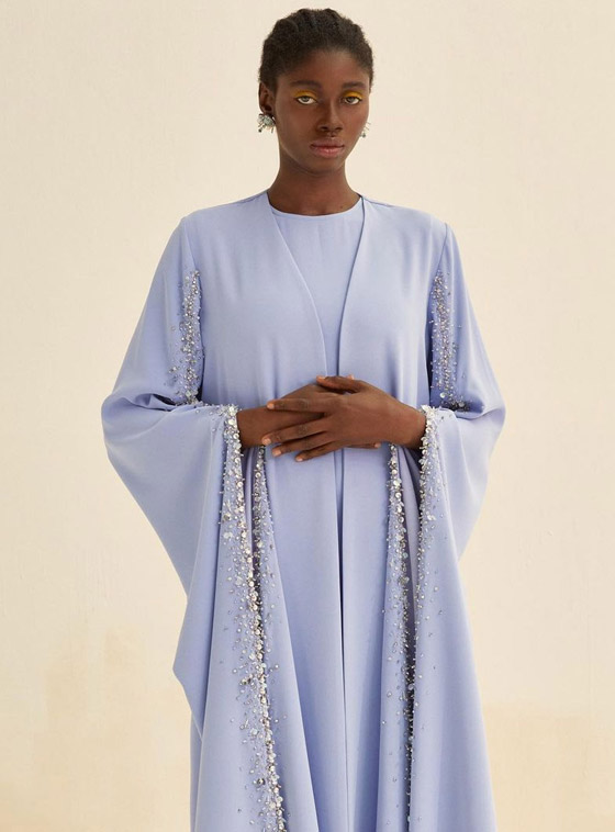حافظت العبايات الخليجية المصممة بألوان الباستيل الحالمة على حضورها ضمن مجموعات 2023 خاصة الموديلات المصممة باللون الأزرق الفاتح Baby Blue Abayas، وجدنا لدى ماركة أناتومي Anatomi عباية فاخرة مزينة بتطريز فضي على الأكمام الطويلة ومنسقة مع فستان سادة من نفس لونها، ننصحك بتنسيق هذه القطعة الأنيقة مع صندال وكلاتش باللون الفضي للحصول على الطلة الفريدة التي تنشدينها.
