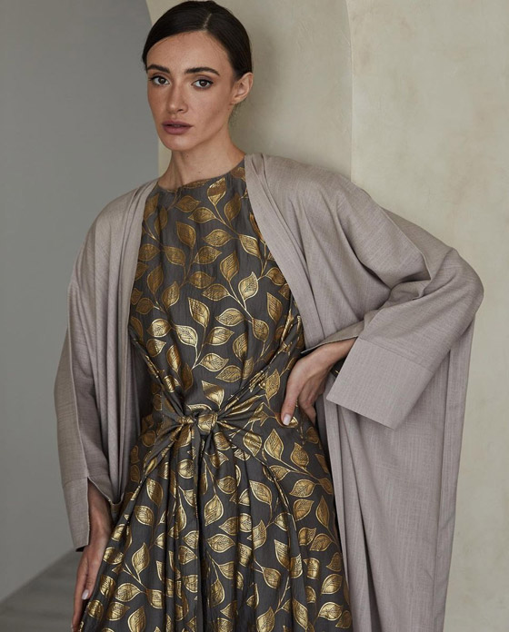 لا تزال العبايات ترابية اللون مهيمنة على ساحة الموضة، وهى من الصيحات المناسبة لصاحبات الذوق الرصين اللواتي يفضلن اللوكات الهادئة والبسيطة، ظهرت عارضة ماركة Zak Collection بعباية رمادية يدخل في تكوينها اللوني أحد نغمات الكاكاو الفاتحة، لفتنا تنسيقها مع الفستان الكاكي المطبع بأوراق الشجر الذهبية محدد الخصر والصندال الأسود بالكعب العالي الرفيع.