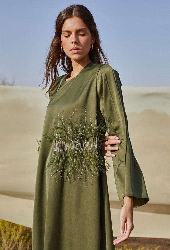 تأتي العبايات الخضراء بمختلف درجاتها على أول قائمة الصيحات الرائجة في صيف 2023، وتفنن المصممون في إبتكار تشكيلة واسعة من أفخم التصاميم، أحببنا منها العباية الستان الخضراء الكاكي المطرزة أسفل الصدر من توقيع ماركة WA Dubai، نسقيها مع فستان طويل سادة من نفس لونها، وانتعلي حذاء Pointed فضي واحملي كلاتش من نفس لونه.