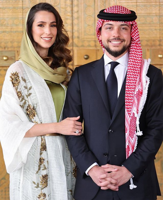 - منذ إعلان خبر خطوبتها على الأمير الحسين، ظهرت رجوة بصور برفقته بزي العباية الشرقي والتقليدي مع الحجاب على الرأس.