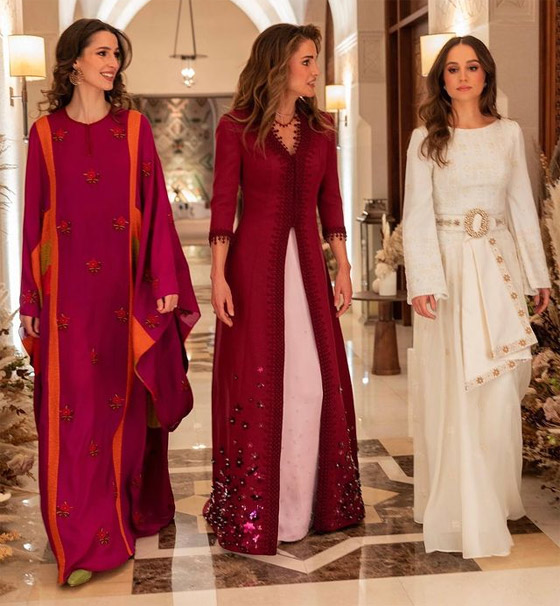 - وفي حفل حناء الأميرة إيمان بنت الملك عبدالله الثاني، اعتمدت رجوة إطلالة تقليدية بالعباية البنفسجية الفخمة التصميم.