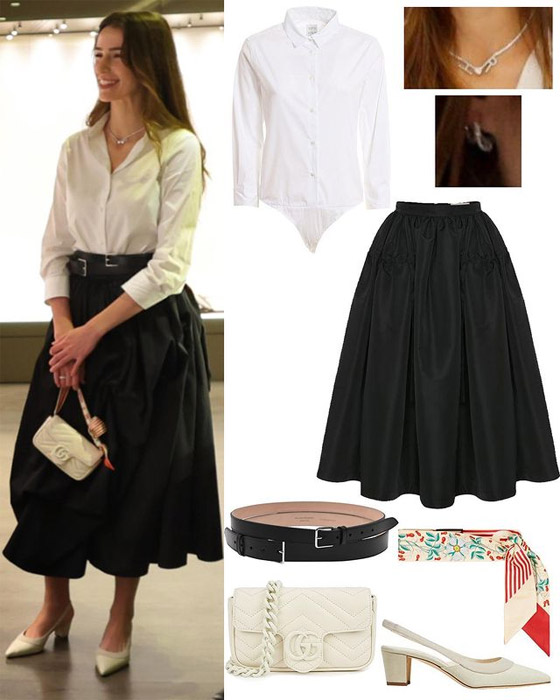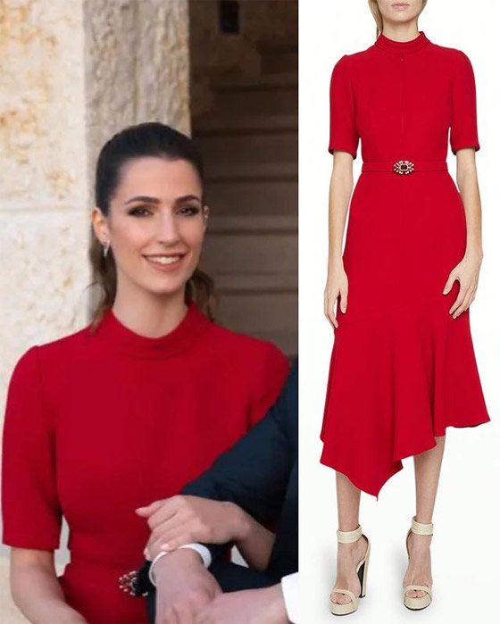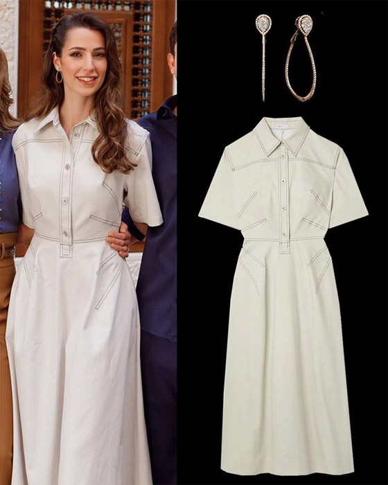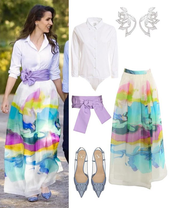 2- تحب القميص الأبيض مع التنانير الواسعة ذات الطيات المتعددة والتي تكون بطول ميدي أو تمتد حتى الكاحل، وهي قريبة من ذوق الملكة رانيا في ذلك وتستطيع إيجاد مبتغاها حتماً لدى دار كارولينا هيريرا. ومن الإطلالات التي سحرتنا تنورة سوداء واسعة من سارة روكا منسقة مع قميص أبيض وحزام جلدي من األكسندر مكوين وقد حملت حقيبة من غوتشي وانتعلت حذاء بيج من مانولو بلانيك Manolo Blahnik. ومن أجمل الإطلالات التي اختارتها بالقميص الأبيض ما ارتدته خلال فترة خطوبتها إذ ظهرت بقميص وتنورة موشحة من سارة روكا وانتعلت حذاء من Valentino فالنتينو وتزينت بأقراط من ستيفن وبستير Steven Webster.