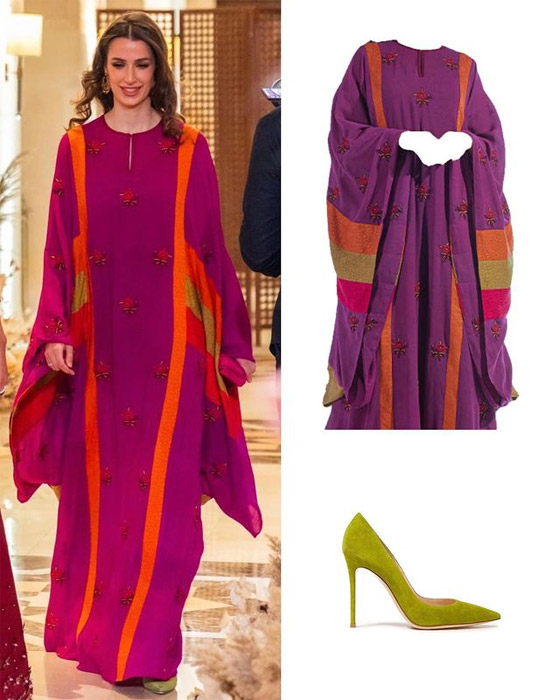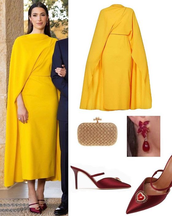 4- تحب الفساتين الكاب المزودة بمشلح على الأكتاف ليضفي إطلالة عصرية وملكية راقية ولا تخشى من ارتداء الألوان القوية كالأصفر الكناري الذي ظهرت فيه في زفاف الأميرة إيمان، وهو من تصميم دار روكساندا Roksanda، وقد حملت حقيبة من بوتيغا فينيتا Bottega Venetta وانتعلت حذاء من مالوني Malone.