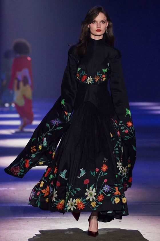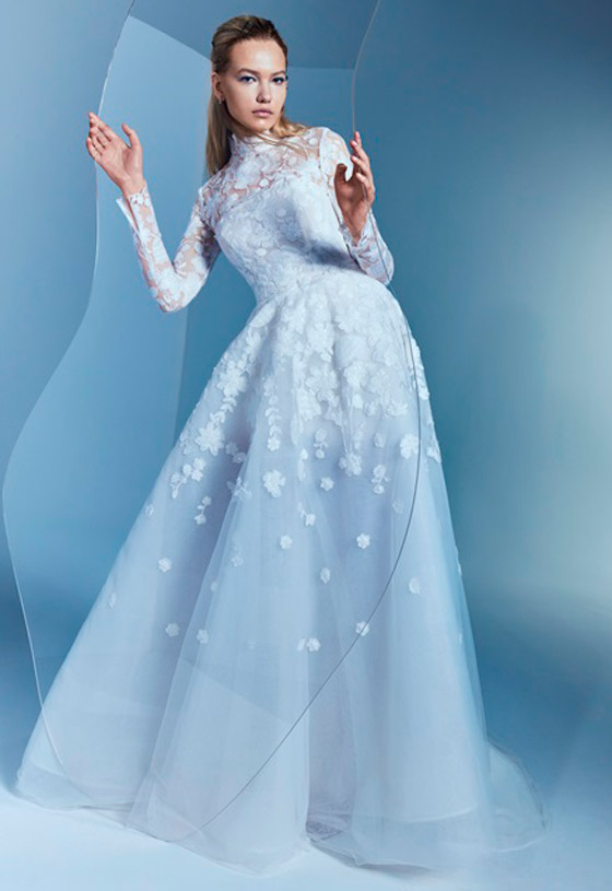 هذا الموديل من علامة ألين "Alyne" من الموديلات الرقيقة والناعمة جداً التي على الرغم من بساطتها؛ فإنها ستلفت انتباه الجميع، كما أنه من التصميمات التي تأتي بلمسات أنيقة جداً، حيث جاء الفستان باللون الأزرق الفاتح وصُمم بأكمام طويلة وضيقة، أما عن التنورة فتأتي بتصميم كلوش طويلة ومنفوشة.