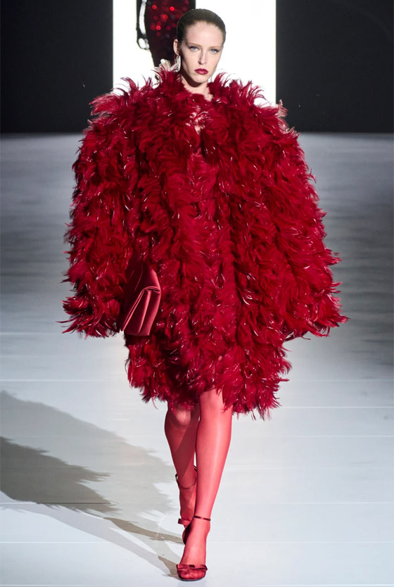 لا تزال موضة الريش مهيمنة على مدرجات العروض، حتى أنها غطت تصاميم بأكملها، كما في المعطف الأحمر الذي تألقت به عارضة ماركة دولتشي آند غابانا Dolce & Gabbana، وهو موديل مثالي لإطلالة سهرة رأس السنة، جربي تنسيقه مع فستان قصير، اختاريه من نفس لون المعطف أو باللون الأسود بشرط أن يكون خالياً من التطريز، وفي كل الأحوال اختاري الحقيبة والحذاء باللون الأسود الملكي.