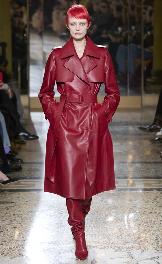 حظي الجلد بحضور كبير على منصات العروض هذا العام، ووظف في تصميم مختلف الأزياء، لا سيما الجاكيتات والمعاطف، رصدنا لدى ماركة إرمانو شيرفينو Ermanno Scervino معطفاً أحمر متوسط الطول يغطي الركبة مزوداً بأزرار على الجانبين وحزام عريض من نفس الخامة واللون، نسقيه خلال النهار مع فستان حرير مطبع يدخل في ألوانه الأحمر، واختاريه من نفس لون المعطف أو أقصر منه قليلاً، وانتعلي بوتاً طويلاً أحمر، واحملي حقيبة سوداء.