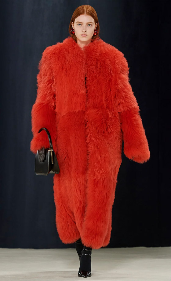 يمنح الفراء لأي إطلالة فخامة فورية من دون أي مجهود، لذا يمكن لمعطف فرو أحمر أن يكمل أناقتك في حفل نهاية العام ، نسقي المعطف الأحمر الطويل الذي اخترناه لكِ من مجموعة ماركة فيراغامو Ferragamo مع جمبسوت أسود سادة واختاري الحقيبة والحذاء باللون الأسود.