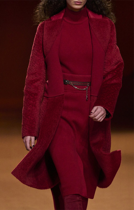 اختاري المعطف الأحمر بطول يصل إلى الركبة أو يتخطاها ببضع السنتيمترات في حال كنتِ تنوين الخروج مع الأصدقاء، فهذا الستايل مثالي للنهار، سيعجبك الموديل الذي ظهرت به عارضة ماركة هيرميس Hermes، لائميه مع كنزة بياقة عالية وتنورة جلد أو صوف محبوكة من نفس لون المعطف، وتممي أناقتك ببوت طويل أسود، واحملي حقيبة Tote سوداء.