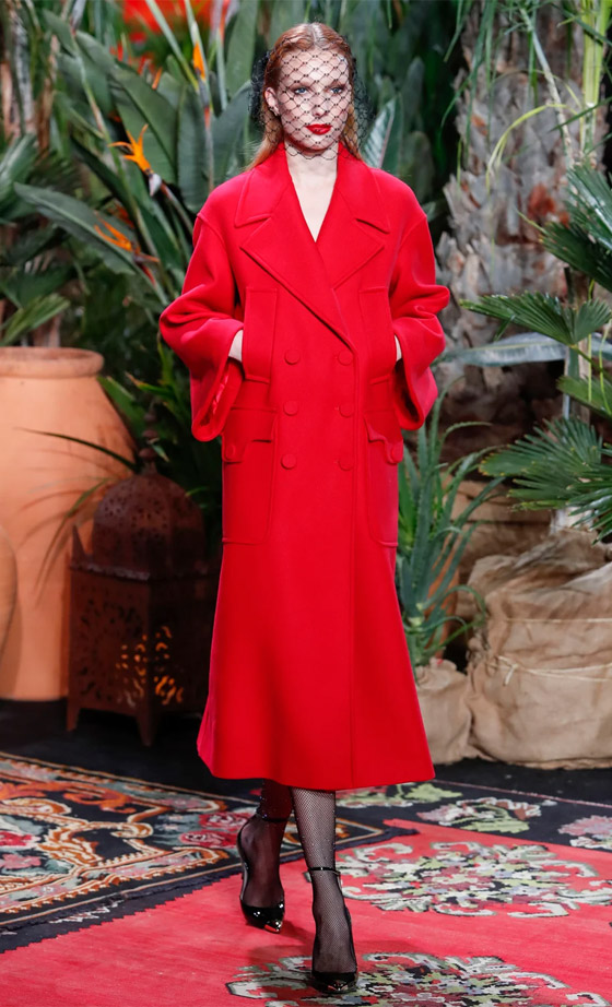 احصلي على إطلالة ملكية وارتدي المعطف الأحمر كالفستان في موسم رأس السنة على طريقة الملكات والأميرات، نرشح لكِ الموديل المزود بأزرار على الجهتين Double Breasted Coat من مجموعة ماركة Jorge Vázquez، نسقيه مع حذاء مدبب أحمر أو أسود مزود بإبزيم يلف الكاحل، واحملي كلاتش عريضاً باللون الأسود.