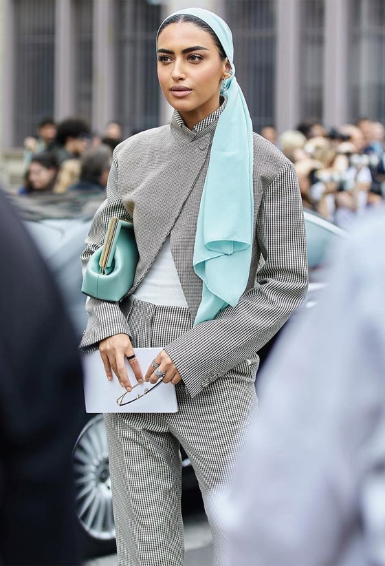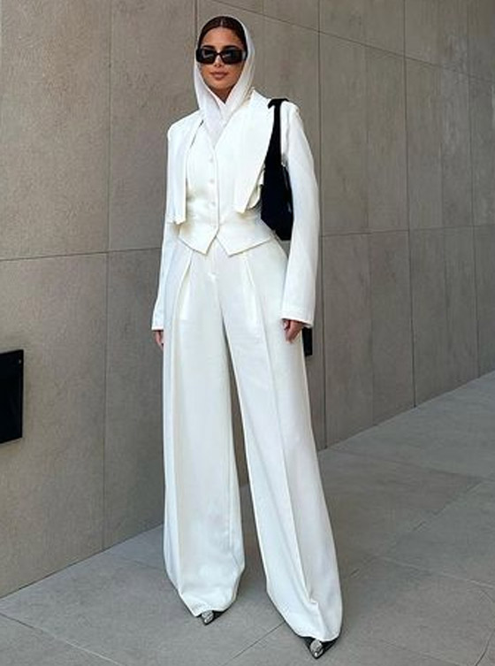 الفاشينيستا المحجبة فاطمة حسام اعتمدت البدلة البيضاء اللون بأسلوب عصري راقي، حيث اختارت اطلالة البدلة باللون الموحد مع بليزر قصيرة والبنطال الواسع الأبيض ونسقت معها حجاب حريري باللون الأبيض.