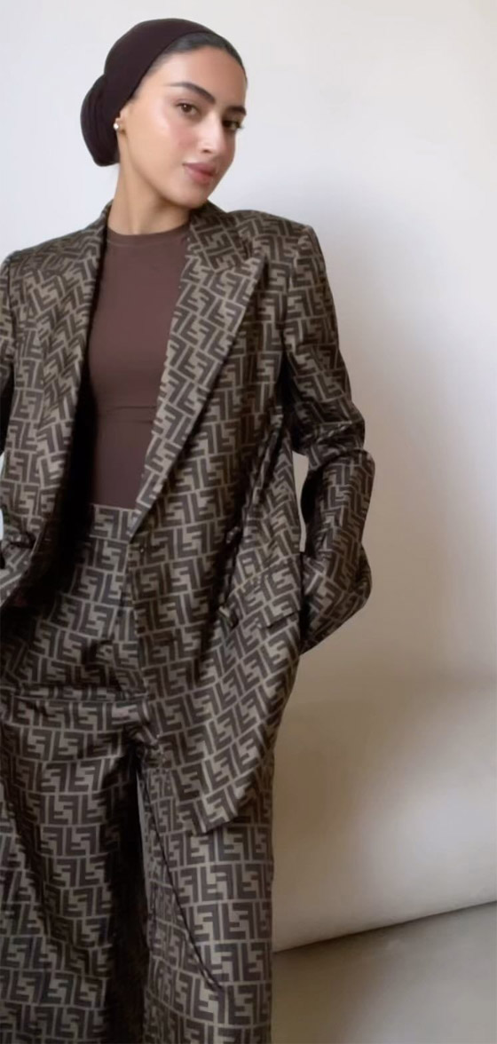 اعتمدت الفاشينيستا سندس القطان اطلالة بالبدلة اليومية الواسعة والمريحة باللون البني التي يمكن للكثير من السيدات المحجبات اعتمادها في اطلالاتهن اليومية.
