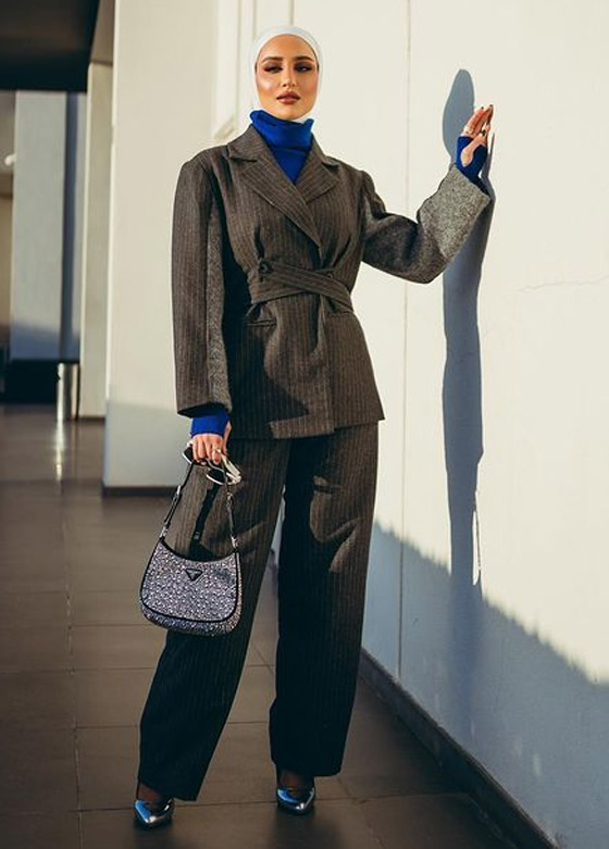 الفاشينيستا المحجبة دلال الدوب اختارت بدلة عصرية التصميم وتميزت بالتقليمات الطولية التي تناسب المرأة المحجبة في فصل الشتاء.