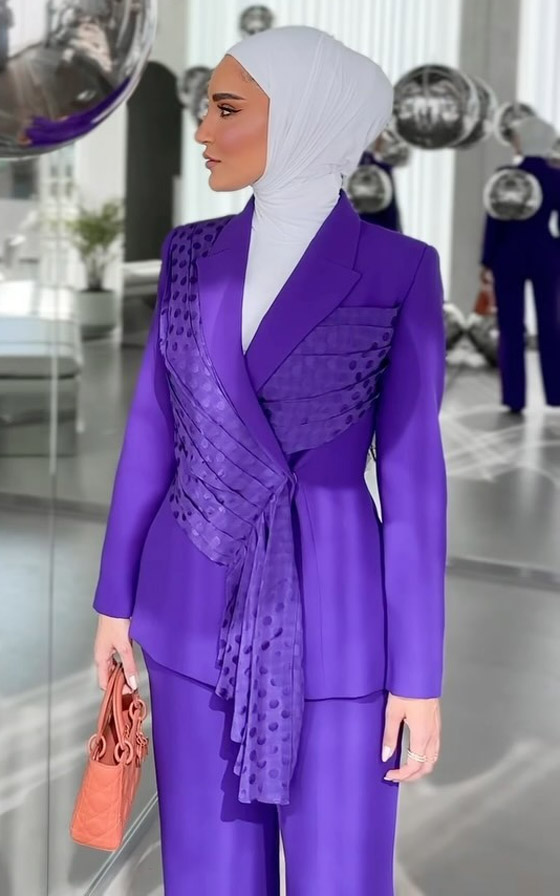 كما اختارت دلال مجموعة ملفتة من البدل المناسبة للمرأة المحجبة تميزت برقي تصاميمها وألوانها القوية المنوعة، كهذه البدلة المميزة باللون البنفسجي التي تميزت بقصة البليزر الغريبة.