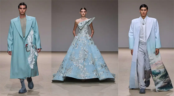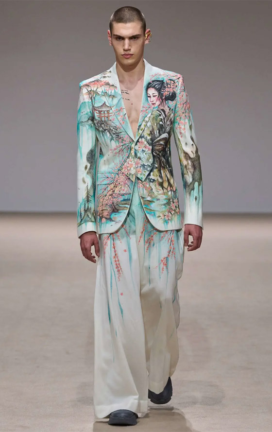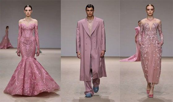 بدأ العرض بمجموعة من الإطلالات باللون الأزرق الفاتح تضمّنت بدلات رجاليّة وأثوابا طويلة زيّنها التطريز، لتليها مجموعة من الأزياء ذات الطابع الرومانسي تلوّنت بالزهري. وقد وجدت جميع تدرجات الليلكي والبنفسجي مكانها في هذا العرض الذي تضمّن أيضاً إطلالات بالأحمر، والرمادي، والأسود، وقد تزيّنت بعض تصاميمه برسومات من وحي الثقافة اليابانية.