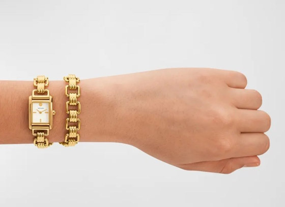 في حالة بحثكِ عن ساعة بسيطة وخالدة، فكري في هذه الساعة من «توري بورش»، فهي مصنوعة من الفولاذ المقاوم للصدأ بلون ذهبي، وتأتي بوزن 24 مم فقط، لذلك ستمتزج مع بقية مجوهراتكِ بسهولة، وتمنحكِ مظهراً مصقولاً وغاية في الروعة، كما أنها تتميز بمشبك مزدوج كبير الحجم على شكل حرف (T).