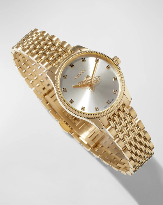 كجزء من مجموعة «G-Timeless»، صنعت هذه الساعة الكلاسيكية من الذهب الأصفر (PVD) مع حزام من جلد الخراف الوردي بحساسية تقليدية، جنباً إلى جنب مع قرص فضي من أشعة الشمس. وتم تصميم شكل النحل خصيصاً للعمل كعقرب ثوانٍ، كما أنها تأتي بحزام قابل للتعديل من 140 ملم، إلى 180 ملم، فضلاً عن أنها مقاومة للماء حتى 50 مترًا.