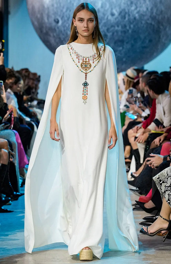 احصلي على إطلالة ملكية تجعلك سيدة التجمعات الأنيقة باعتماد صيحة القفاطين المزودة بالكابات الطويلة، سيعجبك التصميم الراقي الذي قدمه المصمم اللبناني إيلي صعب Elie Saab ضمن مجموعته الجديدة لربيع وصيف 2024، والذي تميز بلونه الأبيض السادة وقصته المستقيمة غير الملاصقة للجسم والأكسسوار المميز ذي الطابع الشرقي الذي يزين الصدر، ارتديه مع صندال Platform أبيض سادة، واحملي كلاتش عريضاً بلون زاهٍ كالفوشيا أو الأحمر.
