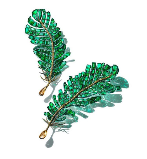 ولعاشقات الزمرد الأخضر، اخترنا لكِ بروش الريش المرصع بالكامل بالزمرد الأخضر مع لمسة ذهبية وفص الألماس الأصفر من Cindy Chao.
