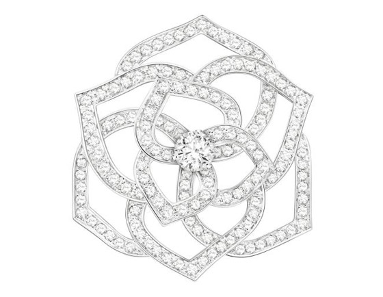 ومن ماركة بياجيه Piaget، اخترنا لكِ هذا البروش الفخم بتصميم الوردة الماسية وهو أيضاً مصنوع من الذهب الأبيض بتصميم رقيق.