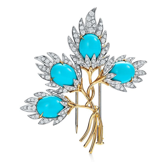 ولأن الفيروز من الأحجار الكريمة الساحرة بلونها التركوازي الأخاذ، فقد يكون هذا البروش المستوحى من الورود كافياً لإضافة لمسة أخاذة لإطلالاتك، وخاصةً أنه يجمع بين الذهب الأبيض والأصفر مع بريق الألماس، من تيفاني آند كو Tiffany & Co.