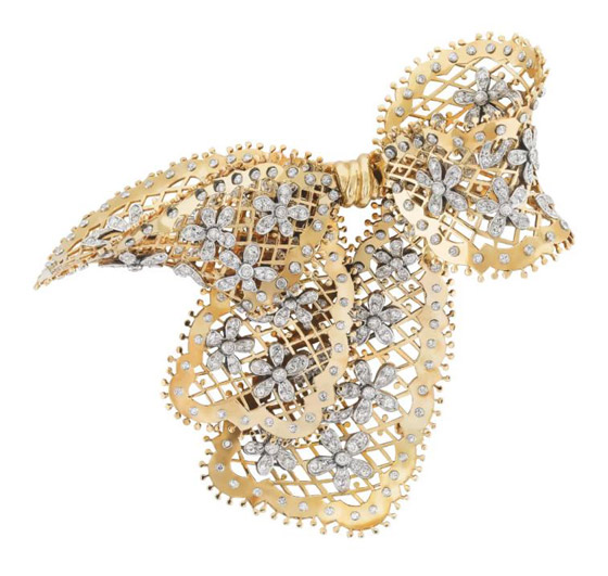 وجمع هذا البروش الرقيق من فان كليف آند آربلز Van Cleef & Arpels بين تصميم الفيونكة والورود الماسية التي تزينه بتناغم اللونين الذهبي والفضي ليزيد اطلالتك سحراً وجاذبية.