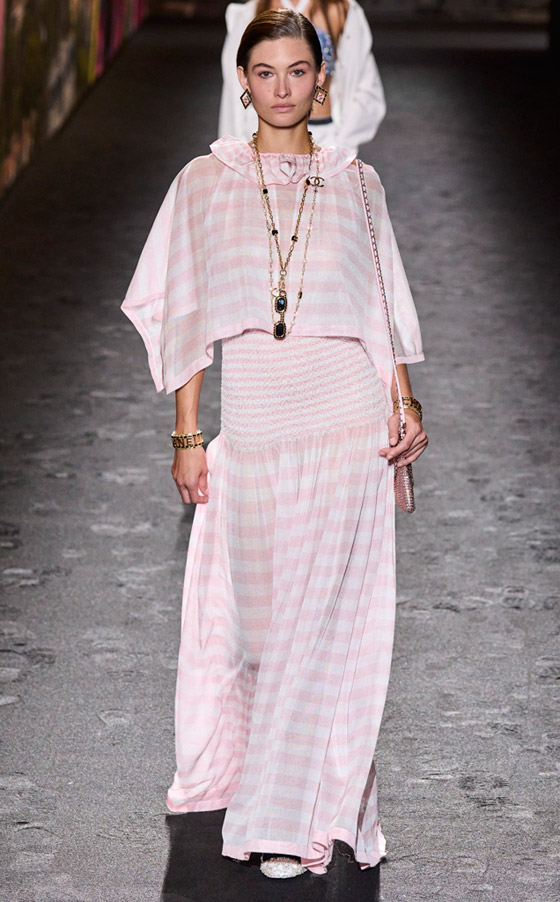 مزجت بعض الماركات بين الطابع الأنثوي والذكوري في تصاميمها؛ فوجدنا الفساتين الطويلة الناعمة مطبعة بالخطوط هذا العام، من جهتنا أحببنا الفستان الناعم المزين بخطوط أفقية وردية فاتحة من مجموعة دار شانيل "Chanel"، نسقيه خلال نهار العيد مع صندال Platform أبيض، واحملي حقيبة كتف صغيرة بيضاء أو وردية، واختاريه مزود بحزام جلد طويل مضفر في سلسال معدني. يناسب هذا الفستان صاحبات الجسم النحيف حيث تساعد الخطوط الأفقية في إكساب الجسم مظهراً أعرض وأكثر امتلاءً.