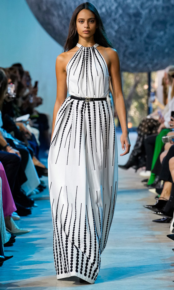 احتلت طبعة نقاط البولكا الكلاسيكية منصات العروض هذا العام، وقدم المصمم إيلي صعب "Elie Saab" واحداً من أجمل الفساتين التي رأيناها هذا العام؛ حيث تميز بخصره العالي، وتنورته المنفوخة، والياقة الملتفة حول العنق. أعجبنا لون الفستان الأبيض المزدان بنقاط سوداء متفاوتة الحجم، ويمكنك التأنق به على مدار اليوم، زينيه بحزام على طريقة العارضة، وانتعلي صندالاً أسود سادة، وتممي أناقتك بحقيبة حمراء. يساعد هذا التصميم في إخفاء عيوب الجسم بفضل تنورته الواسعة؛ لذا نرشحه لصاحبات الجسم الكمثري اللواتي يعانين من شكل الأرداف الممتلئة.