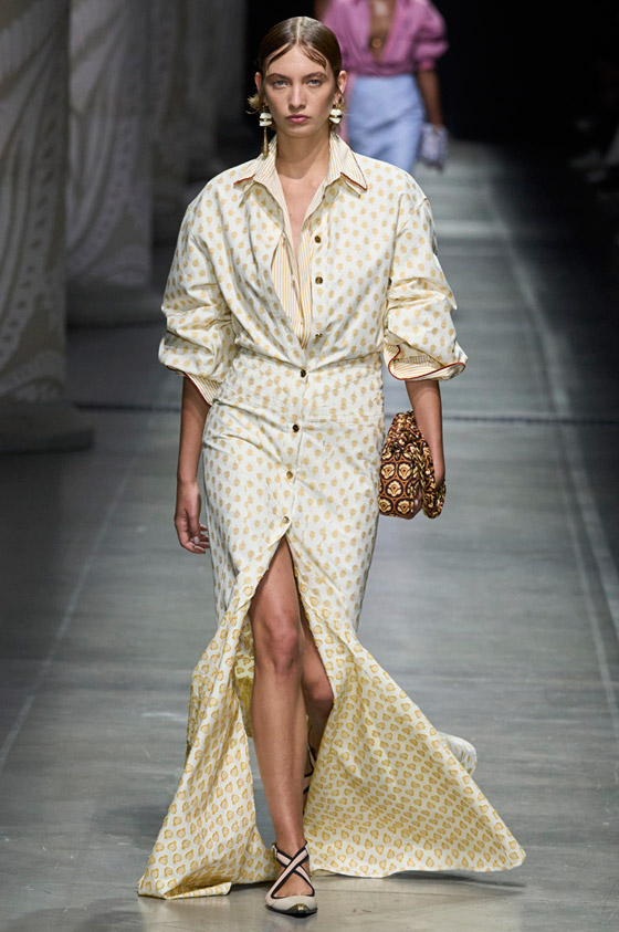 احصلي على إطلالة عصرية أنيقة خلال نهار عيد الفطر، وتألقي بالفساتين المصممة بقصة القميص Shirt Dresses الدارجة بقوة في ربيع وصيف 2024، سيعجبك الفستان الماكسي الأصفر المزين بنقشات ناعمة والمصمم بأكمام منفوخة من مجموعة ماركة إيترو "Etro"، جربي تنسيقه مع صندال ترابي اللون قريب للون الجلد، واحملي حقيبة Pouch من اللون نفسه أو اختاريها باللون الأصفر الفاتح. نرشح هذا التصميم للقصيرات؛ فكون الفستان مفتوح من الأمام إلى منطقة ما فوق الركبة سيساعد في إطالة الساقين بالنسبة إلى الفستان.