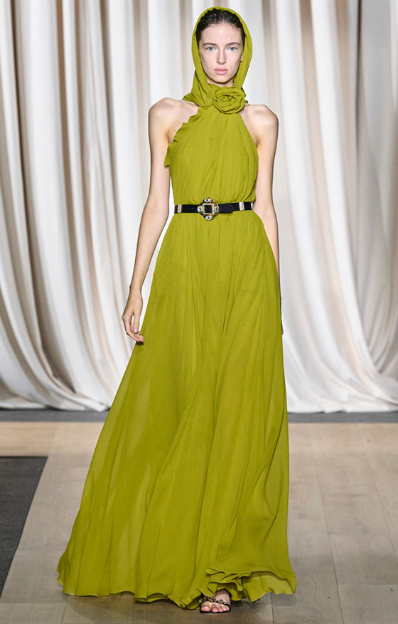 لن تستطيعي أن تتجاهلي موضة الفساتين الماكسي المزودة بأغطية رأس موصولة بها ومصممة من اللون نفسه، التي احتلت الصدارة على مدارج العروض في 2024. رصدنا لدى ماركة جيامباتيستا فالي "Giambattista Valli"؛ فستاناً أخضر مصمماً بقصة انسيابية ستضمن لكِ إطلالة ناعمة خلال المساء، أعجبنا تزيينه بالحزام الأسود الرفيع، وننصحك بإكمال الطلة بصندال أسود، وحقيبة كلاتش عريضة من اللون نفسه. يناسب هذا التصميم صاحبات جسم الساعة الرملية؛ لأنه سيحدد منطقة الخصر النحيل لديهن، كما سيخفي القسم السفلي الممتلئ من الجسم.