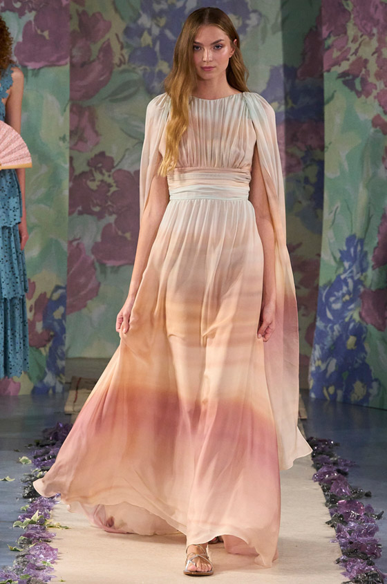 احصلي على إطلالة ملكية خلال عيد الفطر المبارك، وتبني موضة الفساتين المزودة بكابات طويلة منبثقة عن الكتفين، كما في الموديل المصمم بألوان باستيل هادئة من مجموعة ماركة لويزا بيكاريا "Luisa Beccaria"، ونسقيه مع صندال شفاف، واحملي حقيبة باللون السيمون مزودة بسلسال فضي يمكن تعديل طوله. يناسب هذا الفستان كل من ترغب في منح الكتفين مظهراً أعرض؛ لذا نرشحه لصاحبات الجسم الكمثري والنحيفات.