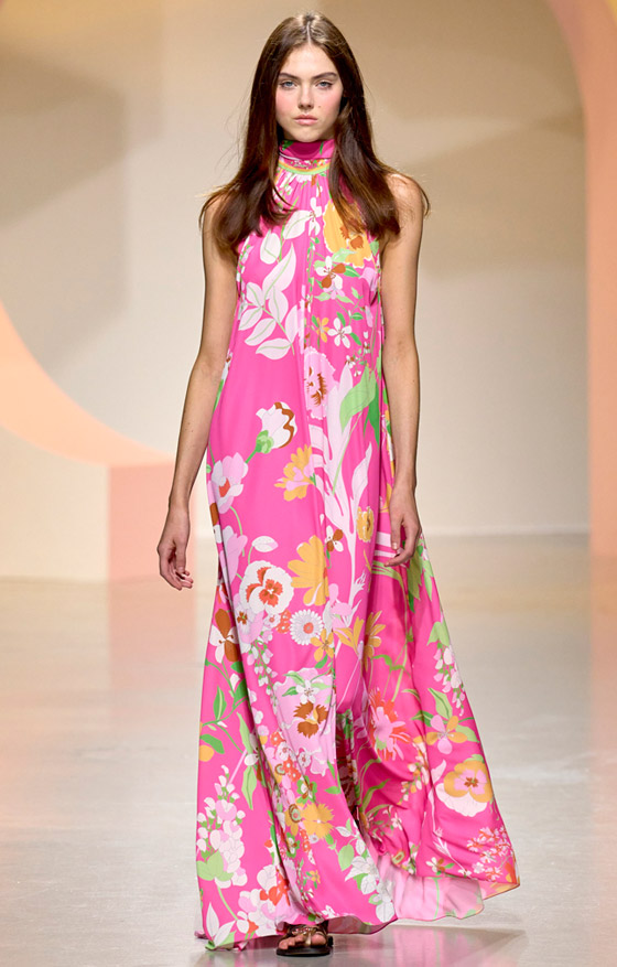 شغلت الفساتين الناعمة الطويلة المصممة بياقات عالية قسماً كبيراً من مجموعات الأزياء الجاهزة، ويبدو أنها ستكون نجمة الصيف القادم، أعجبنا الفستان الزهري الواسع غير محدد الخصر والمطبع بالورود الملونة من مجموعة ماركة ليونارد باريس "Leonard Paris"، نسقيه مع صندال من لونه نفسه، واختاري الحقيبة باللون الأبيض أو الأسود السادة. اختاري هذا التصميم الواسع غير محدد الخصر لتخفي عيوب الجسم، ولا سيما منطقة الخصر الممتلئ والأفخاذ العريضة.