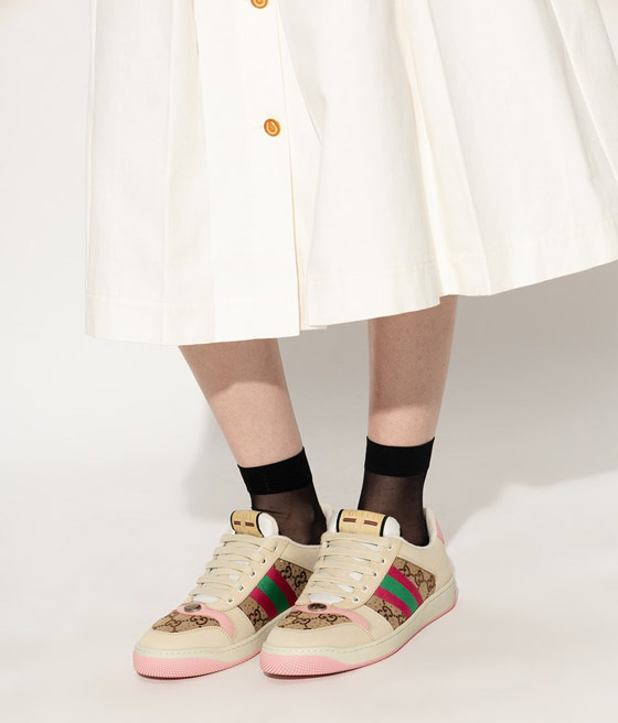 شهد عالم الموضة الفاخرة اتجاهات مؤقتة لا حصر لها، لكن أحد العناصر التي صمدت أمام اختبار الزمن هو حذاء "Gucci Screener" الجلدي الرياضي. ويعد هذا الحذاء رمزاً مثالياً للجمال الكلاسيكي والفخامة العصرية، ويشمل شريط "Gucci" الشهير باللونَيْن: الأخضر والأحمر، وشعار (G) المزدوج الرمزي، والمظهر المهترئ، الذي يمنحه شكلاً قديماً وحيوياً، كالأحذية الرياضية المصنوعة من الجلد المرن، ما يمنحك إطلالة أنيقة، وشعوراً مريحاً.