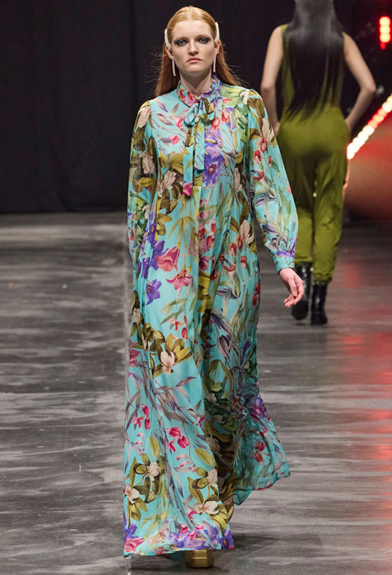 تميز هذا التصميم من مارسيل أوسترتاغ Marcel Ostertag بالعصرية والاحتشام في الوقت نفسه، وهو فستان بأكمام طويلة وقبة مرتفعة ومزينة بشريط الفيونكة، مع قصة تتسع من أسفل، ويجمع بين العديد من الألوان الربيعية الأخاذة، ليناسبك في إطلالاتك اليومية، كما يمكنك اختيار مثل هذا التصميم في السفر والعطلات، وستكون الأكسسوارات باللون الذهبي جذابة ومميزة مع هذا الفستان.