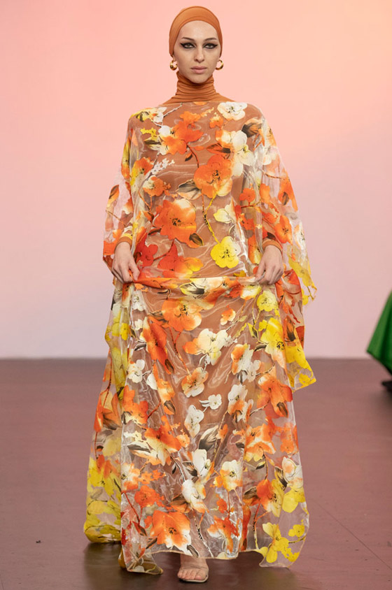 تميل كثير من الفتيات لاختيار الفساتين ذات الألوان النابضة بالحيوية والمبهجة في موسم الربيع، وخاصةً الألوان المستوحاة من الشمس مثل درجات الأصفر والبرتقالي، وبالتالي سينال إعجابهن هذا الفستان من أسيام Asiyam بالقماش الشفاف المزين بالورود الملونة، وقد ظهرت العارضة بإطلالة محتشمة بغطاء الرأس ليلهم المحجبات بلوك أنيق وعصري في الوقت نفسه، ويحتاج هذا الفستان إلى أكسسوارات بسيطة بألوان هادئة مثل البيج ليكتمل سحره.