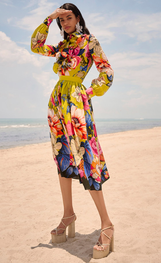 تعتبر الفساتين المنقوشة بأنماط الورود من القطع التي تدوم إلى الأبد، وربما تملكين موديل أو أكثر في خزانتك، ولكنك تحرصين على اقتناء قطع جديدة في كل موسم، لا تقلقي فجميعنا نشاركك هذا الهوس، خاصة إذا وقع نظرنا على قطعة مميزة مثل الفستان الذي يحمل توقيع ماركة نعيم خان Naeem Khan والذي يتميز بأكمامه الطويلة والكشاكش التي تزين الصدر، والمصمم على طراز القميص بطول يغطي الركبة بالكاد، جربي تنسيقه على طريقة العارضة مع صندل Platform بلون قريب للون البشرة، واحملي حقيبة كتف بلون متوفر في طبعة الفستان، ولتكن باللون الزهري أو الأزرق.