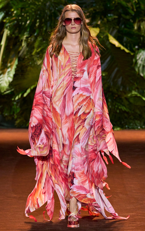 استوحى المصممون أغلب طبعات ربيع وصيف 2024 من الطبيعة، فوجدنا الطبعات المستوحاة من عالم البحار، كما كان للريش حضور مميز وغلفت به تصميمات بأكملها، كما في الفستان المصمم بقصة القفطان الذي تألقت به عارضة روبرتو كافالي ماركة Roberto Cavalli، والذي جمع بين نغمات الزهري والبرتقالي واللذين يعتبران من أبرز توجهات الموسم، لائميه مع صندل وحقيبة باللون البرتقالي الفاتح، وزيدي اللوك تفرداً بارتداء أقراط الـHoops الذهبية.
